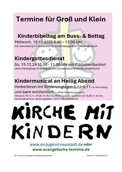 Vom 05.–08.11.2025 finden wieder Kindersingtage statt. Dabei werden Lieder aus Weihnachtsmusicals eingeübt. Ein Teil davon wird im Gottesdienst am Sonntag, 09.11.25 um 10:15 Uhr in der Stadtkirche Neustadt/Aisch aufgeführt – Familie und Freunde sind herzlich eingeladen.